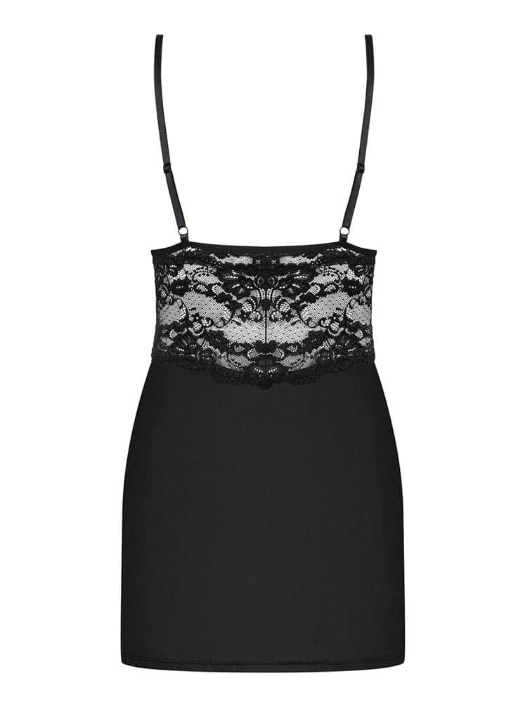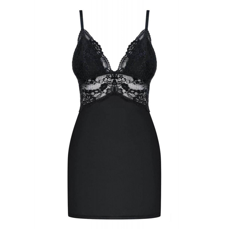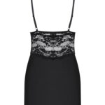 Fekete, csipkebetétes, spagettipántos babydoll hozzáillő női tangával.