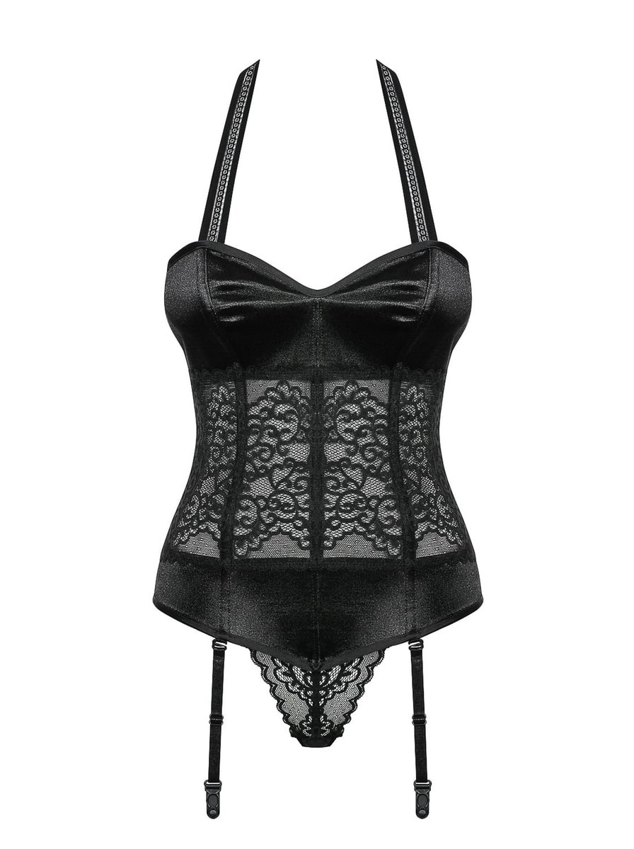 Kissé áttetsző, a csipke és a szatén kombinációjú, állítható és levehető nyakpántos, hátul fűzős, bal oldalán cipzáras, harisnyatartós fűző, tangával. A harisnyát a csomag nem tartalmazza.