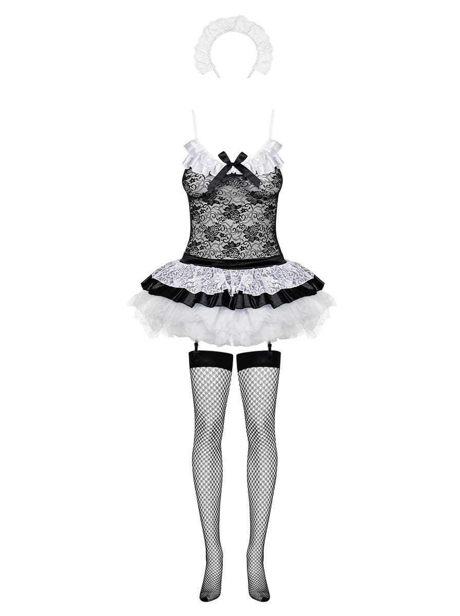 Szexi takarítónő jelmez. A szett tartalma : szoknya, fűző, tanga, fejpánt és harisnya.
