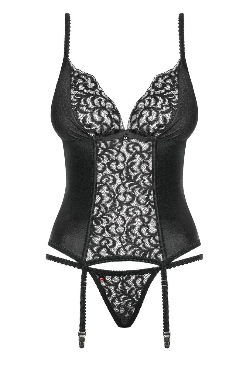 Állítható vállpántos, hátul fűzős, csipkével díszített, kissé áttetsző, harisnyatartós fűző, tangával. A harisnyát a csomag nem tartalmazza.